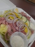 Romaine lettuce, tomatoes, onion, black olives, pepperoni, green peppers, mushrooms, onions, sprinkle of mozzarella cheese, served with creamy Italian dressing on the side.